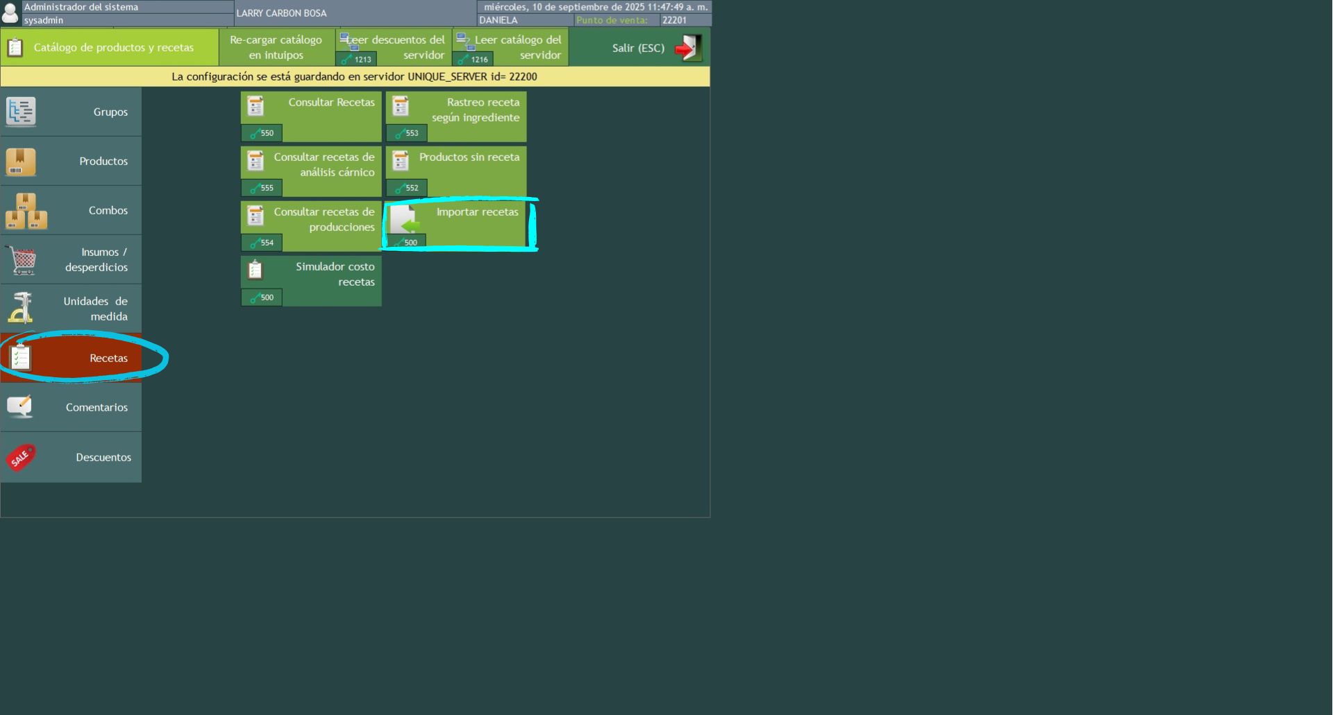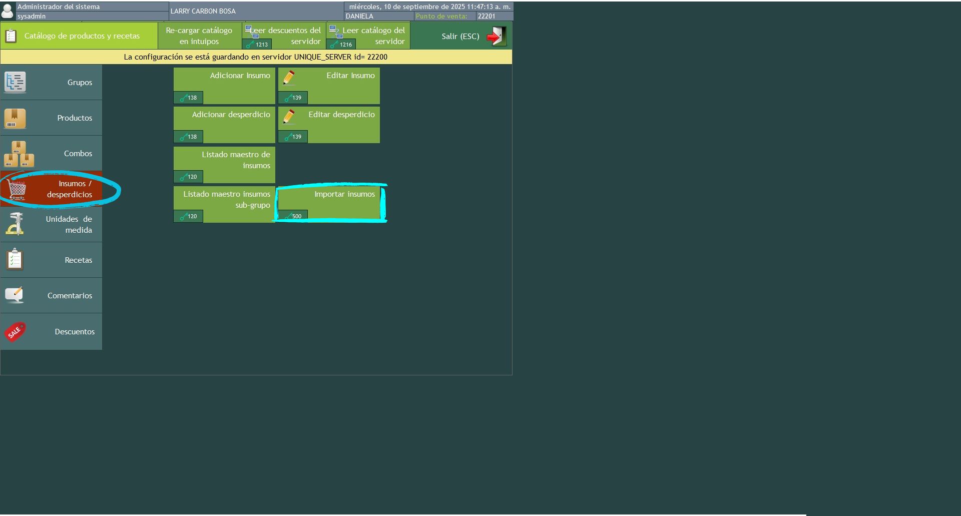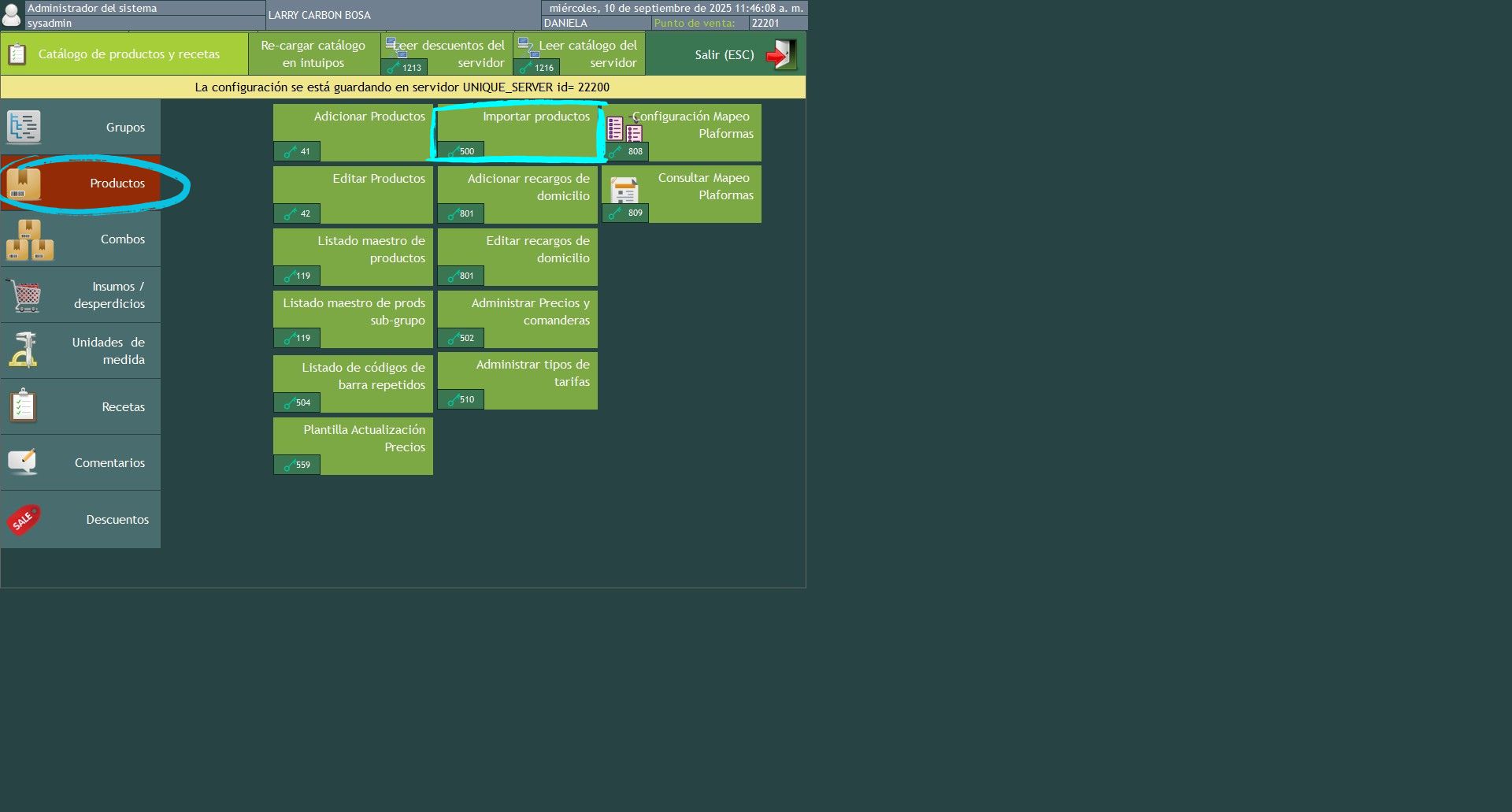 Para realizar las operaciones anteriores se requieren unos permisos, para ello dirigirse a usuarios, permisos, configuración de permisos, seleccionar el rol de usuario y el módulo menú seleccionar catálogo de productos y recetas dentro de este habilitar los permisos, 41 adicional productos, 42 editar productos, 44 adicional grupos ,45 editar grupos, 49 adicionar combos, 50 editar combos ,119 consultar reporte listado maestro de productos, 506 adicionar su grupo, 507 editar su grupo, 503 consultar reporte listado maestro de combos, click, en guardar